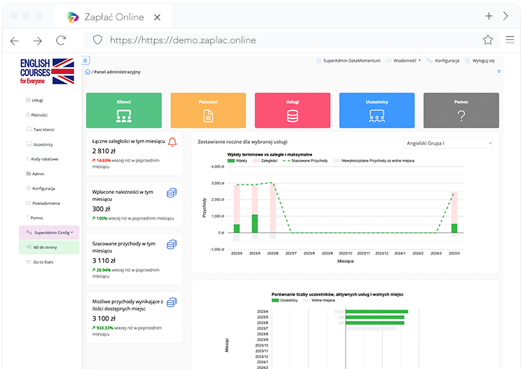 Rozwiń wszystkoZwiń wszystkoWszystkie informacje w jednym miejscuGdziekolwiek jesteś masz ciągły dostęp do wszystkich informacji odnośnie Twojej usługi, aktualnej liczbie uczestników, dokonanej liczbie rezerwacji, wolnych miejscach, dokonanych płatności, czy wysłanych powiadomieńZarządzanie nigdy nie było tak prostePrzejrzysty i intuicyjny panel administracyjny to nowy wymiar pracy dla Twojej firmy, szybkie wprowadzanie i zarządzanie oferta, bieżące informacje odnośnie rezerwacji automatyzacja monotonnych czynności, a przede wszystkim oszczędność Twojego czasuPrzejrzyste zestawienia i statystykiW łatwy i szybki sposób sprawdzisz która grupa ma największe zaległości w płatnościach, bądź w którym miesiącu osiągnąłeś największe przychody